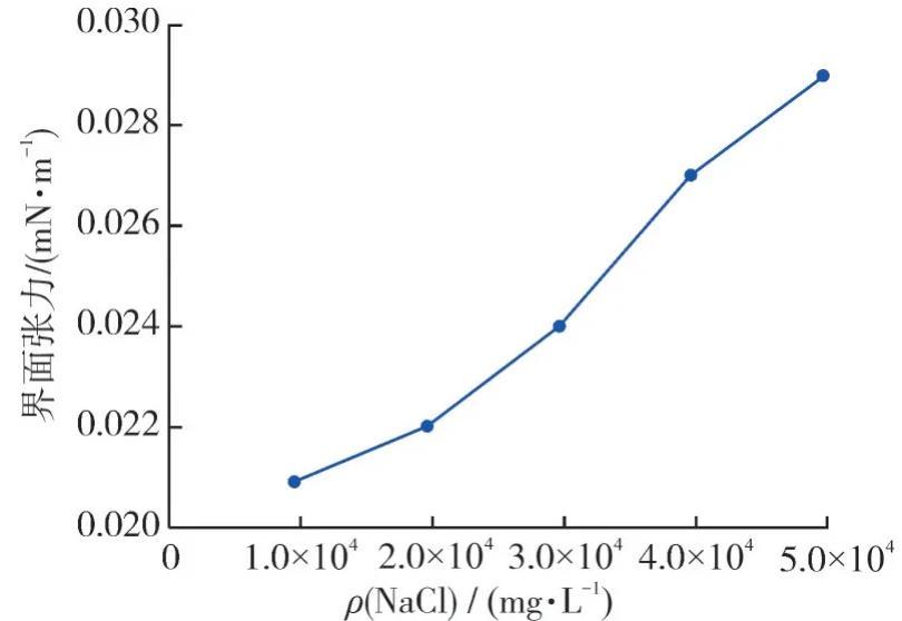 4)隨著礦化度的增加,最佳二元復配體系的界面張力最大只變化了0.008 mN/m左右,證明HPAM和OP-10復配體系保留了非離子表面活性劑的特點,抗鹽性能較好。