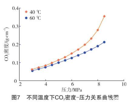 一方面,高溫可以對液體分子之間的相互作用力產生削弱作用,加劇分子間的不規則運動。此時,CO2氣體分子更容易與液相發生混溶,而定量表現出來的就是界面張力的降低。另一方面,根據混合烷烴和CO2的密度和二者的密度差數據,繪制出不同溫度下CO2氣體密度和氣液密度差隨壓力升高的變化曲線,如圖7~圖9所示。從密度差-壓力曲線(見圖9)來看,隨著溫度升高,在可比較的實驗壓力范圍內,中低壓(3~6 MPa)下不同溫度的氣液密度差非常接近,可以忽略不計。但高于6 MPa后,高溫下氣液密度差逐漸加大。較高的密度差導致了氣液難以形成混相,同一壓力下界面張力更大。