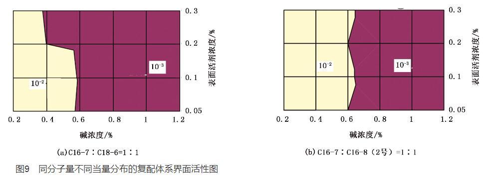 2)同分子量不同當量分布的表面活性劑界面活性范圍從圖8和圖2對比可以得出,表面活性劑平均相對分子量為432時,C18-6測得表面活性劑與堿濃度范圍很寬的超低界面活性范圍,而C16-8(2號)超低界面活性范圍的堿濃度相對于C18-6變窄。同理,在試驗用表面活性劑的復配體系中,試驗圖9表明平均相對分子量為425時,C16-7與C18-6的復配體系形成超低界面活性范圍寬于C16-7與C16-8(2號)的復配體系。說明平均相對分子量相同當量分布不同的表面活性劑界面活性范圍也不相同。