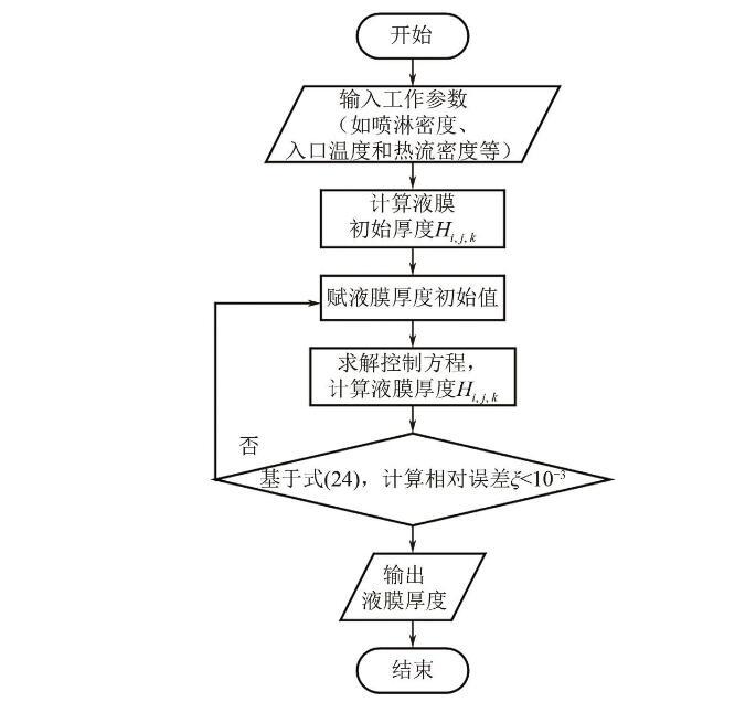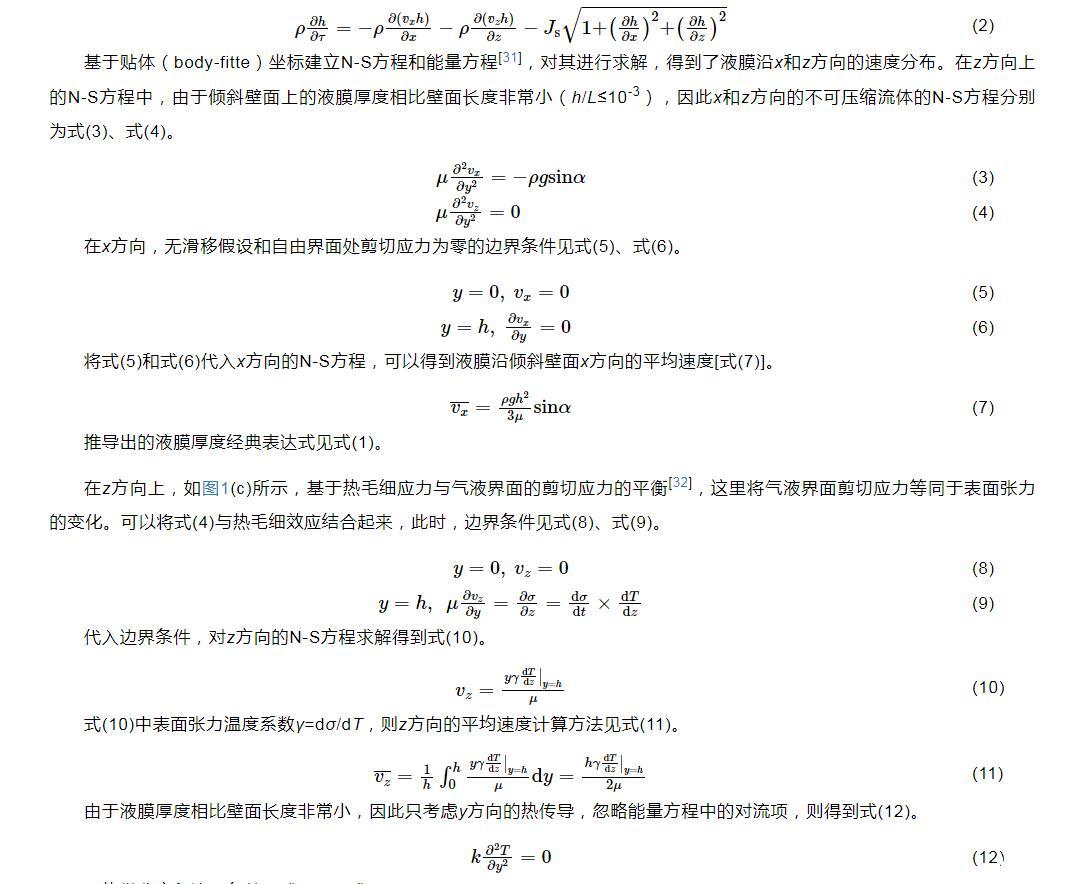 式(1)將作為本文模型計(jì)算的迭代初值。之后,Kapitza首次對(duì)傾斜平板上流動(dòng)液膜的流體動(dòng)力學(xué)不穩(wěn)定性進(jìn)行了研究,對(duì)流動(dòng)液膜的流動(dòng)不穩(wěn)定性和破裂有了初步的認(rèn)識(shí)。隨著實(shí)驗(yàn)方法和測(cè)量技術(shù)的不斷進(jìn)步,研究人員通過更高效的實(shí)驗(yàn)和模擬方法對(duì)流動(dòng)液膜進(jìn)行了深入和廣泛的研究,深化了對(duì)液膜流動(dòng)模式、流動(dòng)特性和蒸發(fā)等內(nèi)在機(jī)制的理解,也為相關(guān)的工業(yè)應(yīng)用提供了重要的科學(xué)依據(jù)。