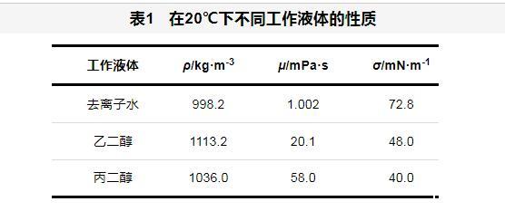 能夠在壁面上完全鋪展的液膜不僅僅與壁面的結構和潤濕性有關,還與液體本身的物性有著密切關系。較高的黏度會導致液膜在流動過程中變得更加穩定且不容易破裂,使得液膜的分布相對均勻;表面張力會改變壁面上液膜的潤濕性,從而影響液膜在壁面上的鋪展能力。因此,深入探討不同物性對液膜分布的影響,具有重要的理論意義和實際應用價值。在實驗中工作液體包括去離子水、乙二醇、丙二醇。工作液體的性質,如表1所示。同時溫度的變化將直接影響液體的黏度和表面張力,隨著溫度的升高液體分子的動能也隨之增強,分子間的相互作用減弱,黏度和表面張力都將減小,進而影響液膜的形成和鋪展,不同溫度下去離子水的性質,如表2所示。
