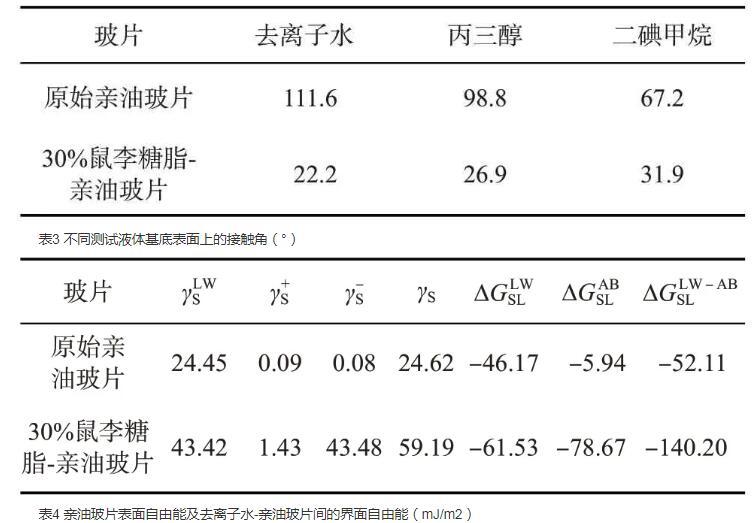 原油開采及運(yùn)移過程中,巖石表面潤濕性對提高采收率十分重要,而巖石表面自由能變化是研究其潤濕性改變的基礎(chǔ),也是其他物質(zhì)與巖石間相互作用的具體體現(xiàn)。本研究主要采用去離子水(Lewis酸堿呈中性)、丙三醇(極性液體)及二碘甲烷(非極性液體)作為檢測液體原始親油玻片及30%鼠李糖脂溶液處理后的親油玻片,計算固體表面自由能,結(jié)果見表3和表4。由不同測試液體基底表面上的接觸角(表3)可見,無論何種測試液體體系,經(jīng)過30%鼠李糖脂溶液的作用,親油玻片的水濕性顯著提升,尤其是在去離子水中。兩種親油玻片表面的自由能及去離子水-親油玻片間的液-固界面自由能見表4。經(jīng)30%鼠李糖脂溶液處理后,親油玻片表面的水相潤濕角顯著下降,導(dǎo)致原始親油玻片的固體表面能γS僅為24.62 mJ/m2,而30%鼠李糖脂-親油玻片的γS卻達(dá)到59.19 mJ/m2,為原始親油玻片的1.5倍。此外,基于Young公式和DLVO擴(kuò)展理論及式(5)—式(7)分析,兩種條件下的親油玻片與去離子水間總存在吸引力,在原始親油玻片與去離子水間的界面相互作用能中,Lifshitz-van der Waals分量更大,說明其界面間主要依靠van der Waals相互作用;而在30%鼠李糖脂溶液作用后的親油玻片與去離子水間作用能中,Lifshitz-van der Waals作用和Lewis酸堿相互作用均存在,因此30%鼠李糖脂-親油玻片與去離子水間的ΔGLW-ABSL更低。自由能越低說明熱力學(xué)更穩(wěn)定,因此相較于原始親油玻片來說,水更易在鼠李糖脂處理后的親油玻片表面吸附。由此可以推測,鼠李糖脂在界面比原油極性分子展現(xiàn)出更強(qiáng)的競爭吸附能力,可將吸附在巖石表面的原油分子脫附,最終改變儲層潤濕性。