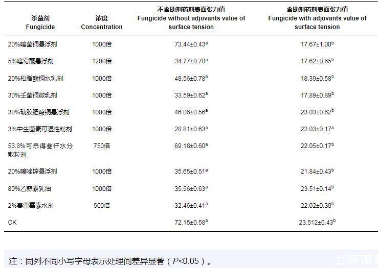 參照各供試殺菌劑田間推薦劑量,分別配置10 mL藥液2組,其中一組添加助劑,一組不含助劑。通過表面張力儀測試各藥液的表面張力值。每組設置3個重復,以水作為空白對照。