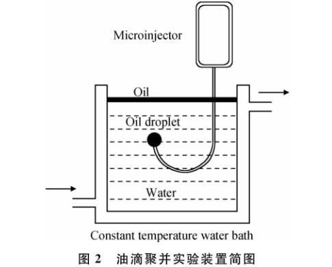 以甲苯與正庚烷(體積比為1/1)為溶劑,將不同原油組分配制成為質(zhì)量分?jǐn)?shù)1%的溶液作為油相,以模擬殘余HMPAM溶液為水相,利用如圖2所示的實驗裝置:由微量注射泵、彎鉤以及可加熱水槽組成,開展油滴聚并實驗以評價液滴穩(wěn)定性(或界面穩(wěn)定性)。利用微量注射泵(可間斷注射)通過彎鉤注射30個30μL的油滴,由于密度差的原因,油滴會在樣品池中上??;在樣品池上層有一層油相,油滴上浮碰到油相時開始計時,當(dāng)油滴完全和油相融合時停止計時,這一段時間可以定義為油滴的聚并時間;這期間的過程利用快速攝像錄下,然后分楨計算后,得到所需聚并時間。