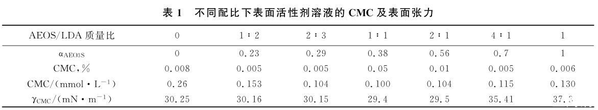 在25℃測(cè)試了AEO3S和烷醇酰胺LDA表面活性劑及其在不同質(zhì)量配比下溶液的表面張力,實(shí)驗(yàn)結(jié)果見圖1。根據(jù)相對(duì)分子質(zhì)量計(jì)算出表面活性劑AEO3S的摩爾分?jǐn)?shù)(αAEO3S)。由圖1中濃度與表面張力的關(guān)系得到溶液的CMC及對(duì)應(yīng)濃度下的表面張力,實(shí)驗(yàn)結(jié)果見表1。