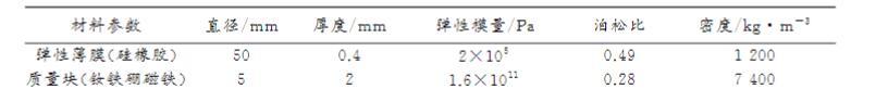 研究對象MAMs結(jié)構(gòu):彈性薄膜中心兩面粘結(jié)圓形質(zhì)量塊。薄膜采用硅橡膠,通過勻膠機制備:按硅膠與固化劑100:3比例混合,低速檔(500 rpm,30s)甩開膠液,高速檔(1000 rpm,30s)均勻涂布于硫酸紙基底,靜置30min后剝離得到。高速檔轉(zhuǎn)速不同會導(dǎo)致薄膜厚度不同(如表1不同轉(zhuǎn)速所得薄膜厚度,具體值因排版缺失未完整顯示)。實驗中,薄膜制備厚度為0.4 mm。質(zhì)量塊采用釹鐵硼磁鐵。材料參數(shù)詳見表2。
