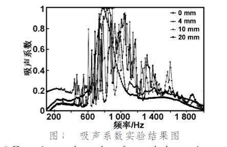 使用10mm后腔,半徑30mm的彈性薄膜分別施加0 mm,4 mm,10 mm,20 mm的拉伸(以改變表面張力),并在薄膜中心粘結(jié)直徑5mm、厚度2mm的質(zhì)量塊。測量吸聲系數(shù)。