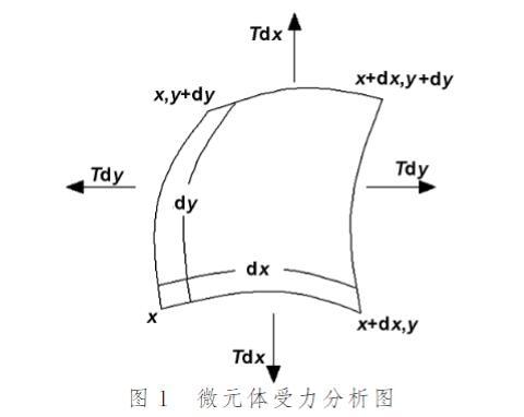 分析薄膜振動需進行受力分析。薄膜所受內(nèi)力僅為張力。設(shè)單位長度薄膜張力為T(N/m),單位面積質(zhì)量為ρ。取薄膜平衡位置在xy平面內(nèi)的微元體分析(圖1),當其受到垂直xy面的外力擾動后,會在張力T作用下產(chǎn)生橫向振動,恢復(fù)力主要為張力。
