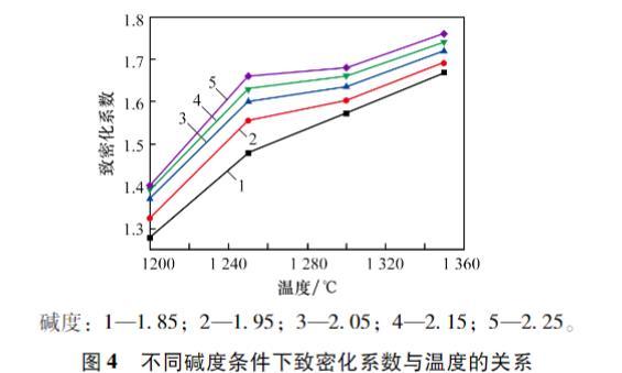 圖4不同堿度條件下致密化系數與溫度的關系