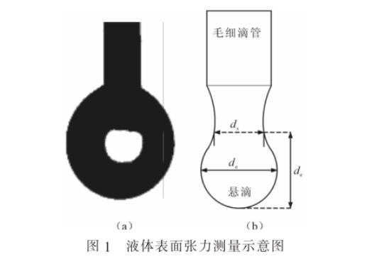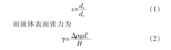 筆者采用液體表面張力的測(cè)量方法為懸滴法,即通過(guò)測(cè)量懸掛著的液滴的外形參數(shù)而推算出液體表面張力,如圖1所示。在憎水角測(cè)試儀配套的微量進(jìn)樣器中滴出液滴,拍攝液滴照片,讀取液滴形態(tài)參數(shù)的像素值,根據(jù)測(cè)量滴管的實(shí)際尺寸和像素值,獲得像素值和實(shí)際尺寸的比例,換算實(shí)際液滴的尺寸參數(shù),并根據(jù)公式推算表面張力。