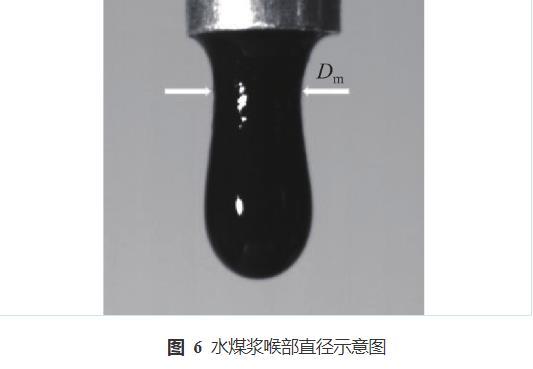 與純液體不同,由于漿體液固混合物流變性和屈服應力等參數的影響,漿體破裂過程更加復雜。在漿體破裂末期,當水煤漿液橋的喉部直徑(Dm,如圖6所示)尺寸很小時,固體顆粒將會發揮顯著影響。典型水煤漿破裂實驗照片如圖7所示,由于微觀破裂條件下液固出現部分分離,煤粉顆粒在液橋喉部附近凸出氣液界面,使得原本光滑的水煤漿表面逐漸粗糙,其變化特性與水煤漿黏度、表面張力和屈服應力等參數密切相關。