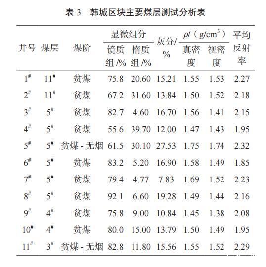 表3韓城區(qū)塊主要煤層測試分析表