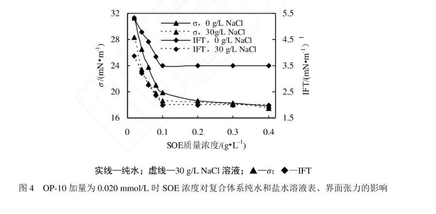 圖4 OP-10加量為0.020 mmol/L時SOE濃度對復合體系純水和鹽水溶液表、界面張力的影響