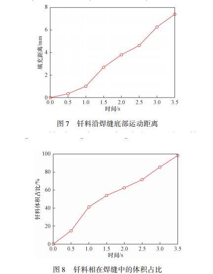液態釬料沿著焊縫下表面的填充距離如圖7所示。前1s內,釬料未潤濕焊縫下表面,曲線上表示為釬料豎直向下運動的距離,此時鋪展速度較為緩慢。當釬料直接接觸焊縫下表面時,驅動力增強,加速了釬料的鋪展。焊接過程中可能會出現微小氣泡從而影響焊接強度,故統計了焊縫內不同時刻下釬料體積占總體積的比值(圖8)。在t=1s之前,前沿流動速度較小,但由于填充截面面積較大,總體鋪展速度仍處于較高的水平。當釬料開始向兩側流動,鋪展速度略微下降。最終得到的釬料填充體積占比達到98.5%,表明焊縫填充效果良好。