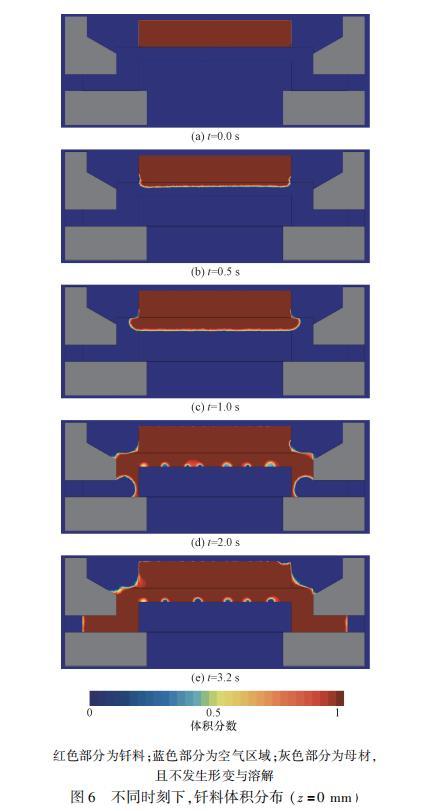 為充分評估釬料填充焊縫的流動,給出了不同時刻下x=0mm截面處的釬料體積分布(圖9),截面兩側釬料融化過程基本呈對稱分布。涂覆釬料從底部開始融化,并不斷填充焊縫,兩側慢慢形成了“凹”形液面。隨著保溫過程進行,釬料均融化為液態,液態釬料在表面張力的作用下收縮為半球形狀。