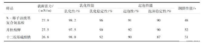 測(cè)定了以大豆粕為原料合成的N-椰子油酰基復(fù)合氨基酸產(chǎn)物表面活性性能,同時(shí)與陰離子表面活性劑月桂酸鉀、十二烷基硫酸鈉表面活性進(jìn)行了比較,結(jié)果見(jiàn)表4。