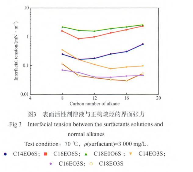 用模擬臨盤(pán)油田地層水將脂肪醇聚氧乙烯醚磺酸鹽配制成質(zhì)量濃度為3 000 mg/L的溶液,在70℃下測(cè)得C14EO3S,C16EO3S,C18EO3S表面活性劑與原油間的界面張力分別為0.076,0.041,0.034 mN/m。表面活性劑溶液與正構(gòu)烷烴的界面張力見(jiàn)圖3。