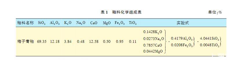龍泉梅子青釉的釉料配方(質量分數)為: 西源瓷土45%、黃壇瓷土20%、獅子籠紫金土3%、石灰石22%、石英10%。該釉配方原料取自龍泉本地瓷土,適用性廣、穩定性好、燒成溫度范圍寬,其化學組成見表1。