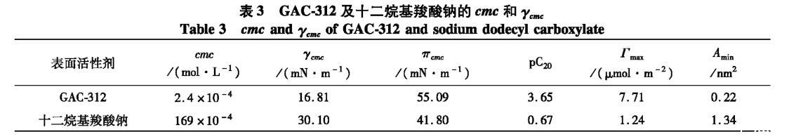 表3 GAC-312及十二烷基羧酸鈉的cmc和γcmc