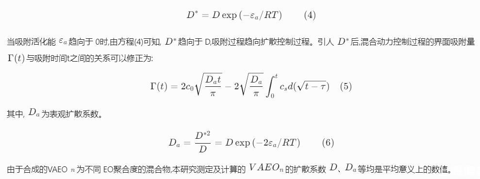 擴散控制的吸附過程,表面活性劑分子由濃度差驅(qū)使進入新表面,不存在吸附勢壘。Word-Tordai方程描述了界面吸附量Г(t)與吸附時間t的關(guān)系:Г(t)=2c0Dtπ-2Dπ∫t0csd(t-τ)(1)式中,c0是溶液本體表面活性劑濃度,mol/L,D是單分子擴散系數(shù),m2/s,cs是次表面表面活性劑濃度,mol/L,τ是整合虛設(shè)變量。方程(1)不能直接求解,可通過極限法求解。在t→0時,表面張力γ(t)近似于溶劑表面張力γ0,表面吸附接近平衡時,γ(t)近似于靜態(tài)表面張力γeq.Fainerman等用漸近的方法對方程(1)進行轉(zhuǎn)化:γ(t→0)=γ0-2nRTc0Dtπ(2)γ(t→∞)=γeq+nRTГ2eqcπ4Dt(3)方程(3)中,t→∞時,c=c0,Γeq表示靜態(tài)表面張力達到平衡時的表面吸附量。混合動力擴散吸附是指表面活性劑分子從本體擴散到次表面仍然遵循擴散機理,但從次表面層擴散到表面層時需克服一定的勢壘。Liggieri和Ravera[15,16]提出,次表面層中的分子,只有能量大于吸附活化能εa才能被吸附到表面,已吸附的分子,只有能量大于解吸活化能εb才能被解吸。以Word-Tordai方程為基礎(chǔ),引入矯正擴散系數(shù)D?。矯正擴散系數(shù)D?和擴散系數(shù)D關(guān)系定義為:D?=Dexp(——εa/RT)(4)當(dāng)吸附活化能εa趨向于0時,由方程(4)可知,D?趨向于D,吸附過程趨向擴散控制過程。引入D?后,混合動力控制過程的界面吸附量Г(t)與吸附時間t之間的關(guān)系可以修正為:Г(t)=2c0Datπ-2Daπ∫t0csd(t-τ)(5)其中,Da為表觀擴散系數(shù)。Da=D?2D=Dexp(——2εa/RT)(6)由于合成的VAEOn為不同EO聚合度的混合物,本研究測定及計算的VAEOn的擴散系數(shù)D、Da等均是平均意義上的數(shù)值。
