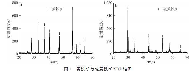 取適量待測粉末狀樣品,壓片制備厚度為1.5~2 mm的平整試片。將試片置于X射線衍射(XRD)儀中進行檢測,通過設定儀器參數,獲得礦樣XRD譜圖。黃鐵礦與磁黃鐵礦XRD譜圖見圖1。