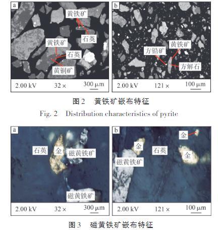 由圖3可知:磁黃鐵礦在礦石中主要以嵌布形式存在,主要嵌布于脈石礦物粒間,少量嵌布在脈石礦物裂隙中。嵌布于脈石礦物粒間的磁黃鐵礦粒度以大于0.037 mm為主,而嵌布在脈石礦物裂隙中的磁黃鐵礦多呈細脈狀構造產出。常見金礦物與磁黃鐵礦連晶嵌布于脈石礦物粒間,這表明磁黃鐵礦與金礦物之間存在密切的關系,磁黃鐵礦同樣是主要載金礦物。