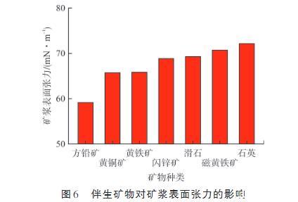 對礦漿濃度為30%的黃銅礦、方鉛礦、滑石、閃鋅礦及石英的礦漿表面張力進行了測定。在pH=7、粒度-0.074 mm占比80%的條件下,考察了黃鐵礦與磁黃鐵礦及伴生礦物質量比為7∶3時,不同伴生礦物對礦漿表面張力的影響,結果見圖6。由圖6可知:不同礦物的礦漿表面張力存在差異,具體為石英72.17 mN/m、磁黃鐵礦70.72 mN/m、滑石69.31 mN/m、閃鋅礦68.88 mN/m、黃鐵礦65.89 mN/m、黃銅礦65.72 mN/m、方鉛礦59.14 mN/m。分析結果表明,方鉛礦的礦漿表面張力最低,而石英的礦漿表面張力與水的表面張力(72.80 mN/m)最為接近。