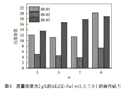 洗滌劑在生活和生產中都扮演著重要的角色,而表面活性劑是各種洗滌劑的主要成分。因此,測試了JB-01,JB-02及JB-03三種污布在不同EO加合數的表面活性劑溶液AEnCE-Na中洗滌前后的白度值,并將同一塊污布在洗滌前后的白度值作差,得到如圖8所示的結果。