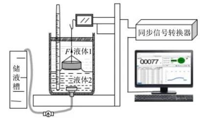 圖1為自制2種液體間界面張力的動態(tài)實(shí)時測量裝置圖,該儀器主要包括電腦顯示器、同步信號轉(zhuǎn)換器、自制實(shí)驗(yàn)架臺、力敏傳感器、金屬吊環(huán)、恒溫杯、溫度計、排液孔、排液管、流速調(diào)節(jié)器和儲液槽等組成.