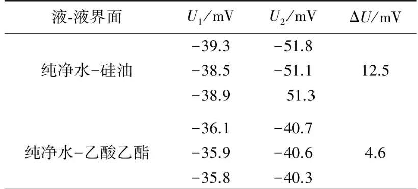 實(shí)驗(yàn)測量所用金屬吊環(huán)的外徑、內(nèi)徑分別為0.034 96 m和0.033 10 m.在20℃實(shí)驗(yàn)條件下,采用自制2種液體間界面張力的動態(tài)實(shí)時測量儀,測量了純凈水-硅油和純凈水-乙酸乙酯間的界面張力.測量出金屬吊環(huán)由液體I中完全進(jìn)入液體Ⅱ的過程中,液體I的液膜被拉斷前電壓的最大值U1,拉斷后趨于穩(wěn)定時的電壓值為U2,數(shù)據(jù)結(jié)果如表1所示.