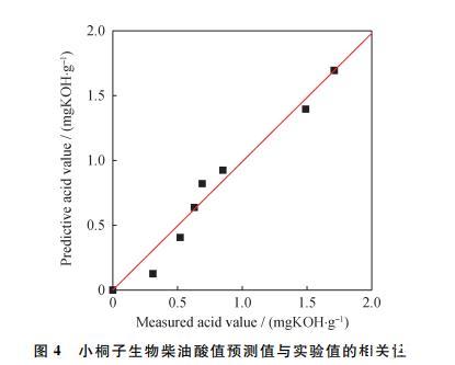 圖4為小桐子生物柴油的酸值實驗值與對數模型預測值的函數關系: