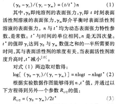其中,即純溶劑的表面張力,即t時刻表面活性劑溶液的表面張力,即介平衡時表面活性劑溶液的表面張力。n與t均為動態(tài)表面張力特性參數(shù),是常數(shù)。t與時間的單位相同,n是無因次量。t的值即達到。與7數(shù)值之和的一半所需要的時間,其與表面活性劑的濃度有關,當表面活性劑濃度升高時,t減小。