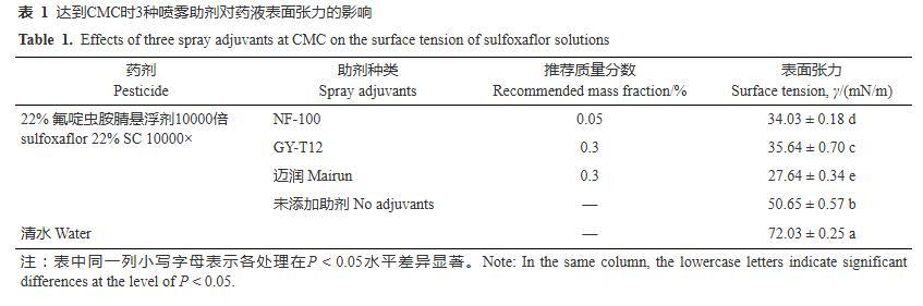 當(dāng)溶液中的表面活性物質(zhì)的質(zhì)量濃度達(dá)到其CMC時(shí),液體具有良好的吸附和潤(rùn)濕性,因此確定助劑的最低施用濃度以大于等于其CMC為依據(jù)。3種噴霧助劑的CMC測(cè)定結(jié)果見(jiàn)圖1。NF-100、GY-T12和邁潤(rùn)3種噴霧助劑的CMC的對(duì)數(shù)值分別為2.40、3.43和3.46,得到其CMC分別為250、2708和2877 mg/L,其中糖基類表面活性劑NF-100具有更低的CMC,比另外兩種低一個(gè)數(shù)量級(jí)。根據(jù)助劑添加量應(yīng)適當(dāng)大于其CMC的原則,考慮量取方便,將NF-100的添加量確定為500 mg/L、折算為質(zhì)量分?jǐn)?shù)0.05%,將GY-T12和邁潤(rùn)的添加量確定為3000 mg/L、折算為質(zhì)量分?jǐn)?shù)0.3%。在此添加量下,測(cè)定了3種噴霧助劑對(duì)氟啶蟲(chóng)胺腈藥液表面張力的影響。結(jié)果(表1)表明,添加NF-100、GY-T12和邁潤(rùn)3種助劑后,氟啶蟲(chóng)胺腈藥液的表面張力顯著降低,由未添加助劑時(shí)的50.65 mN/m分別降低至34.03、35.64和27.64 mN/m,其中邁潤(rùn)對(duì)藥液表面張力的降低效果最顯著,3種助劑之間均存在顯著差異(P<0.05)。