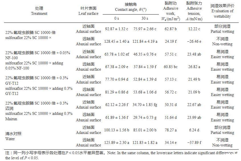 表2氟啶蟲(chóng)胺腈添加助劑在蘋果葉片表面接觸角、黏附功及黏附張力的變化