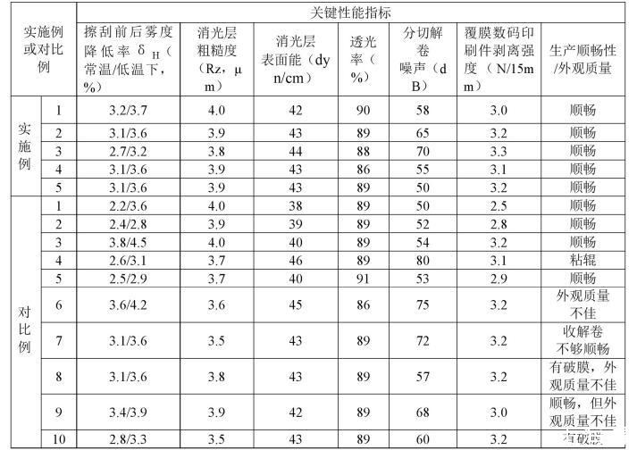 從實施例1~實施例5的數據可知,本發明的耐擦刮無膠消光膜在常溫和低溫環境下均具有良好的耐擦刮性能,實現了消光層表面在耐擦刮性、高表面張力(與印刷適性正相關)與收解卷順暢性的平衡。其中實施例4中球體抗粘連劑為球體聚硅氧烷,雖然制得的薄膜的透光率相比實施例2有所下降,但是薄膜的分切解卷噪聲降低明顯,總體性能是符合本申請要達到的目標的。實施例5中,在熱復合層中加入了適宜熔融指數的高密度聚乙烯,其制備的耐擦刮無膠消光膜表現出更低的分切解卷噪聲,解卷順暢性更好,且未對薄膜的透光率和熱復合層與印刷件之間的剝離強度產生不良影響。
