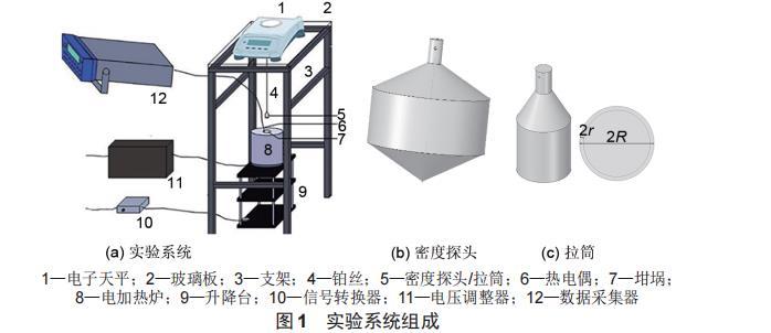實驗系統由測量系統、加熱系統、控制系統和支撐系統組成。實驗系統如圖1(a)所示。測量系統由高精度電子天平(型號為METTLER TOLEDO ME104,精度為0.1 mg)、數據采集器(型號為key sight 34872 A)、熱電偶(K型)、探頭組成;加熱系統由電加熱爐和坩坩堝堝組成;控制系統由電壓調整器(型號為T6-1-4-060 DC)、智俊軟件組成;支撐系統由升降臺、鋼架、玻璃板組成。