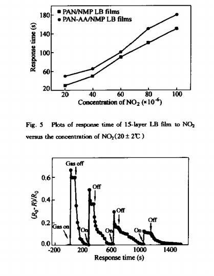 而對于聚苯胺與乙酸的混合LB膜,隨著氣體濃度的增加,電阻升高的原因可認為是在高濃度NO?的氧化作用下,發生了類似于脫摻雜行為而導致的結果。同時在圖7(b)中還發現聚苯胺與乙酸的混合LB膜的NO?氣敏性減小,這可能是由于聚苯胺被乙酸摻雜后,乙酸分子占據了聚苯胺中對NO?分子敏感的部位(如亞胺上的N原子),使得NO?氧化摻雜的可能性減小,從而導致敏感程度的降低以及響應-恢復可逆性的喪失。