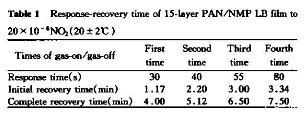 在恢復的初期,吸附在敏感膜表面上的NO?氣體分子將發生較快的脫附;而在隨后直至完全恢復的這段較長的時間里,擴散進敏感膜體內的NO?分子將發生非常復雜的脫附過程:在LB膜和NO?氣體之間的吸附與脫附作用是一個動態過程,脫附的NO?分子又有可能吸附于LB膜表面或擴散進膜內部,尤其隨著通氣與排氣的次數增加,這種情況就更加復雜。