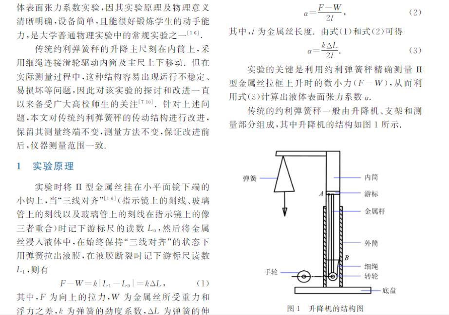 約利彈簧秤是一種精細彈簧秤,常用來測定微小的力。利用約利彈簧秤采用拉脫法測量液體表面張力系數實驗,因其實驗原理及物理意義清晰明確,設備簡單,且能很好鍛煉學生的動手能力,是大學普通物理實驗中的常規實驗之一。