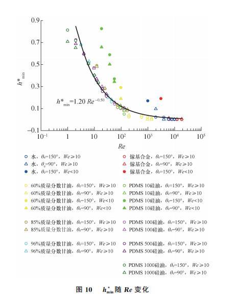 此外,當Re接近于1時,hmin明顯偏離hmin∝Re-0.5規律,其原因與上文所述一致,即高黏度液滴低速碰撞壁面時,液滴更多的表現出自然鋪展特性。