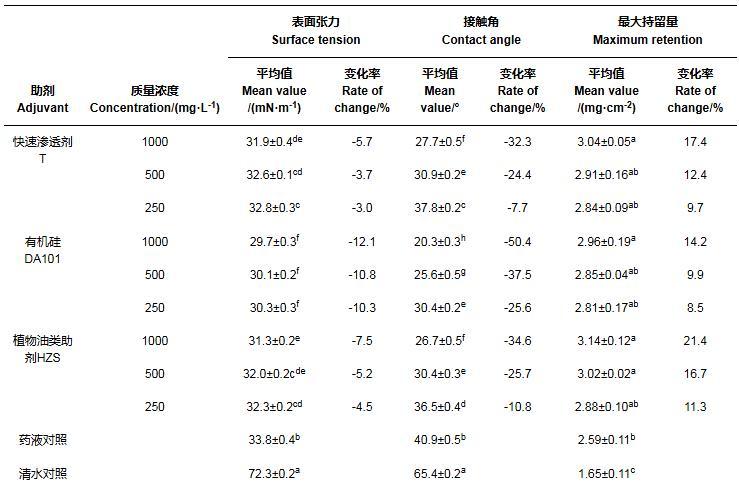 表2添加3種助劑后100 g/L聯苯菊酯乳油藥液表面張力、葉面接觸角和最大持留量的變化