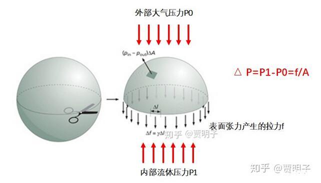 而這里有一件非常關(guān)鍵的事請(qǐng),就是由于表面張力的存在,彎曲的表面就會(huì)在兩側(cè)形成壓力差。就好像緊繃的氣球,其內(nèi)部壓力要高于外部的壓力。這種壓力差來自哪里?當(dāng)然就是氣球皮膜緊繃的張力。由于氣球的彎曲表面,使得其張力最終表現(xiàn)為內(nèi)部壓力的升高。