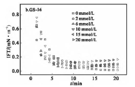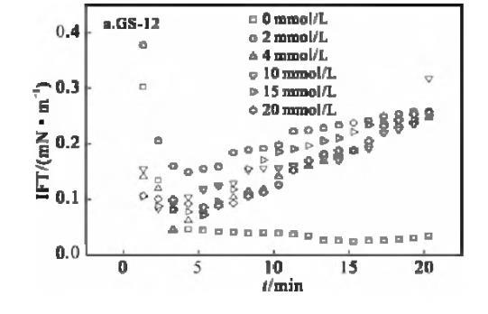 表面活性劑/油體系的動態(tài)界面張力行為,對驅(qū)油過程具有重要意義。動態(tài)界面張力是驅(qū)油過程中各種復(fù)雜物理化學(xué)反應(yīng)的具體體現(xiàn)。因此,研究動態(tài)界面增長力及其影響因素非常重要。溶液中離子強度增加,將影響表面活性劑分子在水相中的溶解度,改變雙電層參量,而導(dǎo)致油水界面表面活性劑濃度的改變。一般情況下,添加的鹽可以通過中和表面活性劑分子在界面上頭基的電荷來減弱表面活性劑分子之間的靜電斥力,導(dǎo)致IFT降低[5]。溫度為30℃下,不同KBr鹽濃度下,GS-12,GS-16的煤油/表面活性劑溶液界面張力隨時間的變化曲線見圖6。