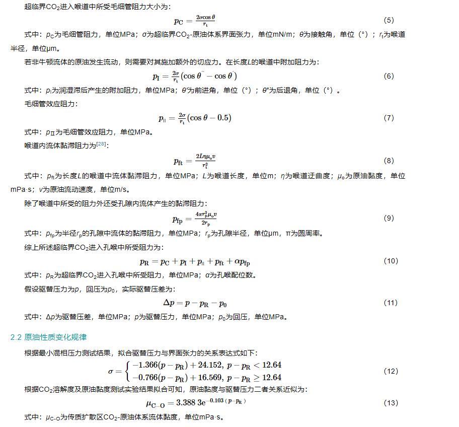 CO2進入孔喉時與原油的接觸時間較短,來不及進行擴散、溶解,此時原油和CO2的物理性質(zhì)尚未發(fā)生變化。超臨界CO2進入喉道中所受毛細管阻力是由超臨界CO2-原油界面張力、潤濕接觸角、孔喉半徑等參數(shù)共同引起: