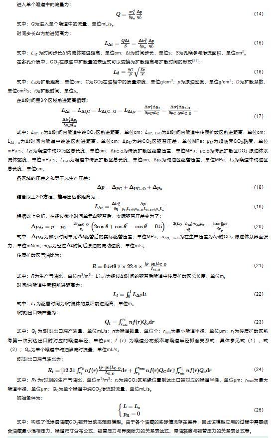 CO2驅(qū)能有效提高低滲透油藏采收率,但由于低滲透油藏普遍存在強非均質(zhì)性,導(dǎo)致CO2驅(qū)開發(fā)動態(tài)難以準確預(yù)測。針對該問題,在綜合考慮喉道大小及分布、CO2溶解降黏和界面張力變化等因素的基礎(chǔ)上,結(jié)合CO2驅(qū)滲流力學(xué)理論,建立了基于時間節(jié)點的低滲透油藏CO2驅(qū)開發(fā)全過程動態(tài)預(yù)測模型。