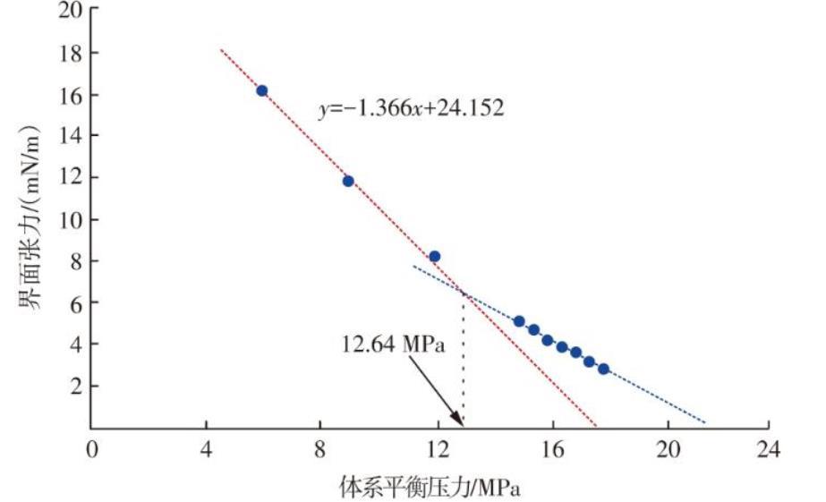 如圖2所示,懸滴法測試結(jié)果表明:當(dāng)體系平衡壓力<12.64 MPa時,界面張力隨體系平衡壓力的增大而快速減小,其線性擬合的直線與X軸交點位于17.56 MPa,該體系平衡壓力為多級接觸最小混相壓力;當(dāng)體系平衡壓力≥12.64 MPa時,界面張力減小幅度變緩,線性擬合的直線與X軸交點位于21.63 MPa,代表了CO2與原油一次接觸最小混相壓力。