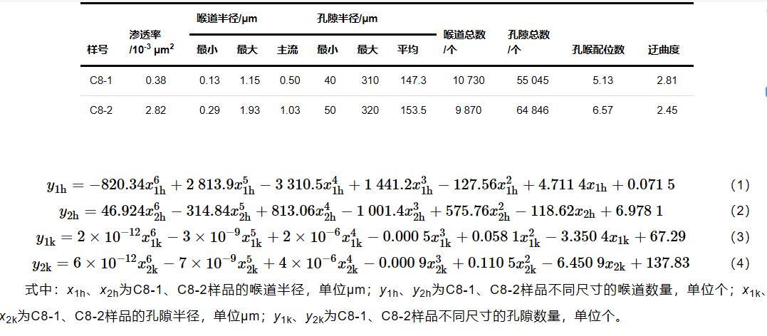 式中:x1h、x2h為C8-1、C8-2樣品的喉道半徑,單位μm;y1h、y2h為C8-1、C8-2樣品不同尺寸的喉道數(shù)量,單位個;x1k、x2k為C8-1、C8-2樣品的孔隙半徑,單位μm;y1k、y2k為C8-1、C8-2樣品不同尺寸的孔隙數(shù)量,單位個。