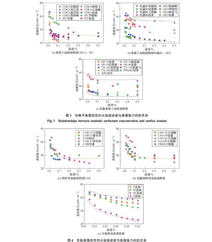 采用文獻調(diào)查法,匯總分析了82組不同類型表面活性劑水溶液濃度與表面張力的對應(yīng)關(guān)系[19-34],如圖1~圖4所示。