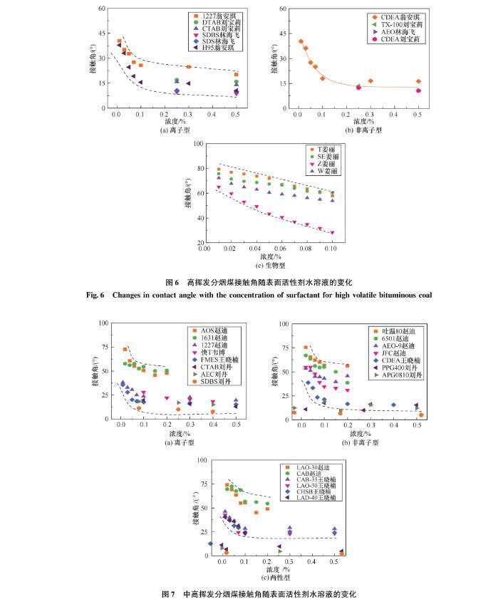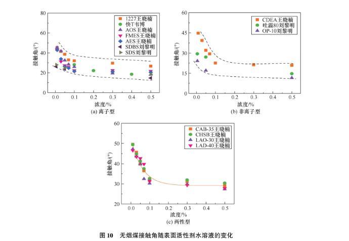 圖8中揮發(fā)分煙煤接觸角隨表面活性劑水溶液的變化