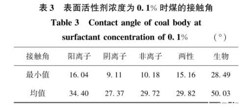 以接觸角作為判斷潤濕的標(biāo)準(zhǔn),接觸角越小則潤濕性能越好。表面活性劑濃度為0.1%時,煤巖接觸角統(tǒng)計結(jié)果見表3。當(dāng)活性劑水溶液濃度為0.1%時,陰離子表面活性劑AES水溶液與煤的接觸角最小為9.11°。進一步將不同類型表面活性劑水溶液在濃度為0.1%時與煤的接觸角進行均值化處理可發(fā)現(xiàn),陽離子、陰離子、非離子、兩性及生物表面活性劑水溶液與煤的接觸角平均值分別為34.4°、27.37°、29.72°、29.82°和50.03°。因此,表面活性劑潤濕性效果排序為:陰離子表面活性劑>非離子表面活性劑>兩性表面活性劑>陽離子表面活性劑>生物表面活性劑。